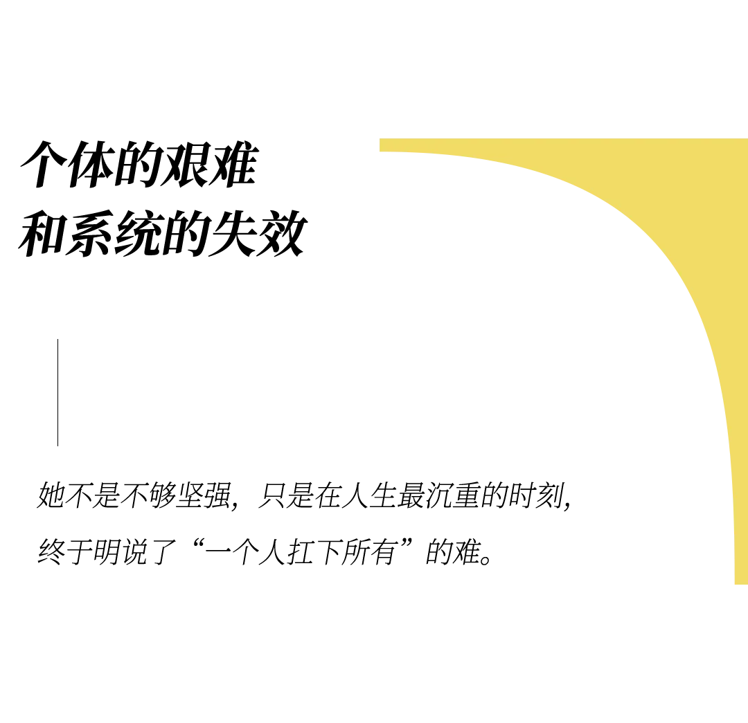 而乐乐妈妈在她小时候因为产后抑郁最终选择出走,何尝又不是另一个系统失灵的典型案例。当所有育儿的重担都仅落在妈妈身上时,当所有人都习惯性忽视生育给女人带来的损伤和疼痛时,当没有任何个人、集体为这样的妈妈提供帮助时,我们又该如何想象一条更好的自救道路?所以当乐乐将自己从“受害者”的视角中抽离开后,她开始用同为女性的心理解妈妈曾经的选择,理解她的恐惧,她的疲惫,她的辛苦,“我很羡慕你,因为你比我更勇敢”。